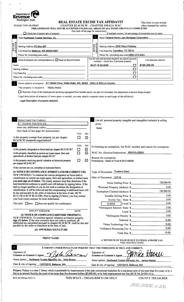 | 4 | 12/14/2015 | TRUSTEES D | TRUSTEE'S DEED | WALLIS DOLORES | FEDERAL HOME LOAN MORTGAGE CORP | | | $130,594.00 | 129331 | 2015-10603 |
