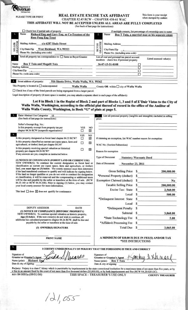 | 2 | 11/29/2011 | WARRANTY D | WARRANTY DEED | ENG, ROSE FONG TRUST | TUIA, BEN & MAGALLI | | | $200,000.00 | 121055 | 2011-09368 |