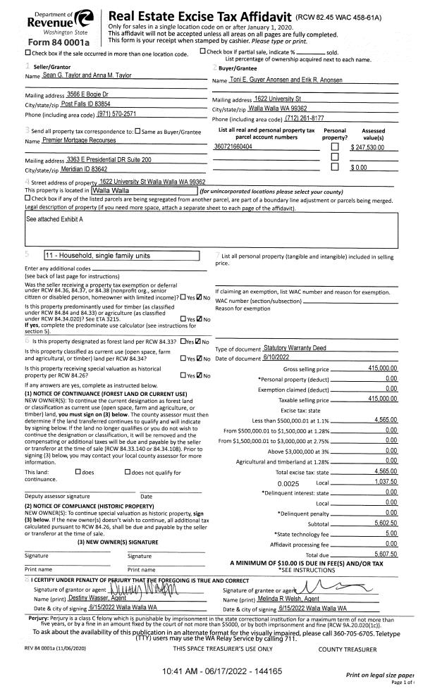 | 1 | 06/17/2022 | SWD | STATUTORY WARRANTY DEED | TAYLOR SEAN G & ANNA M | ANONSEN TONI E GUYER & ERIK R | | | $415,000.00 | 144165 | 2022-05144 |