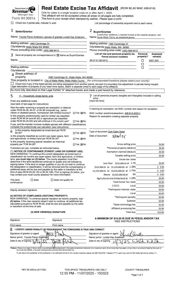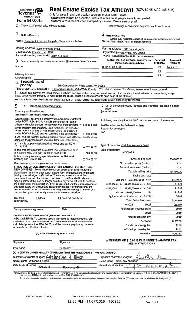 | 1 | 11/07/2025 | SWD | STATUTORY WARRANTY DEED | OLSON KATHERINE J & JOSEPH M | ANDERSON LORELEI KAY & SUSAN MARIE TRAVIS | | | $345,000.00 | 150322 | 2025-06915 |