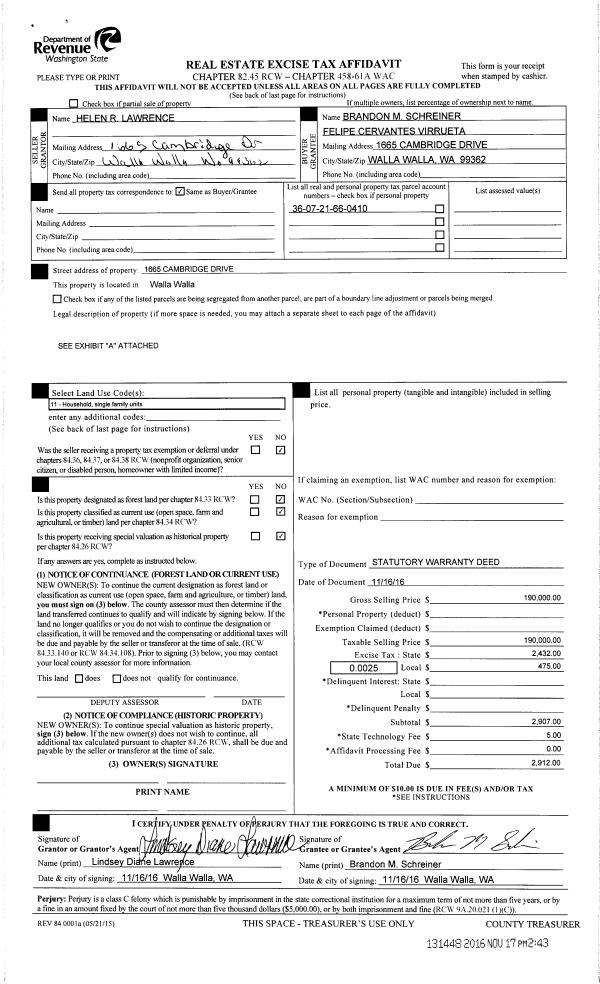 | 3 | 11/17/2016 | SWD | STATUTORY WARRANTY DEED | LAWRENCE HELEN R | SCHREINER BRANDON M | | | $190,000.00 | 131448 | 2016-09513 |