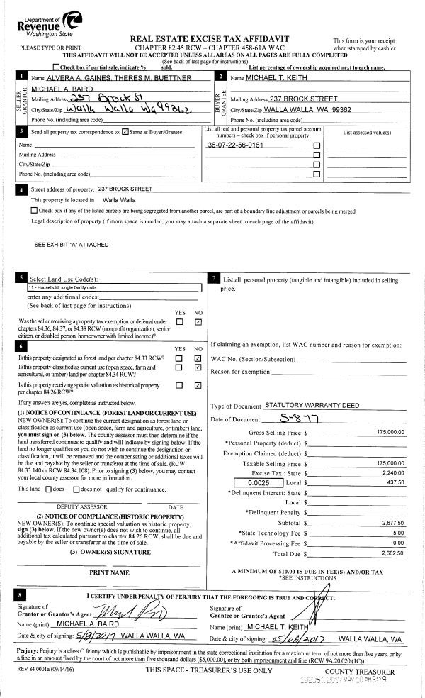 | 2 | 05/10/2017 | SWD | STATUTORY WARRANTY DEED | GAINES ALVERA A LIFE EST | KEITH MICHAEL T | | | $175,000.00 | 132351 | 2017-03526 |