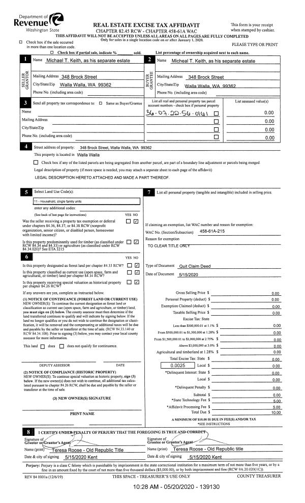 | 1 | 05/15/2020 | QCD | QUIT CLAIM DEED | KEITH MICHAEL T | KEITH MICHEAL T | | | $0.00 | 139130 | 2020-04393 |