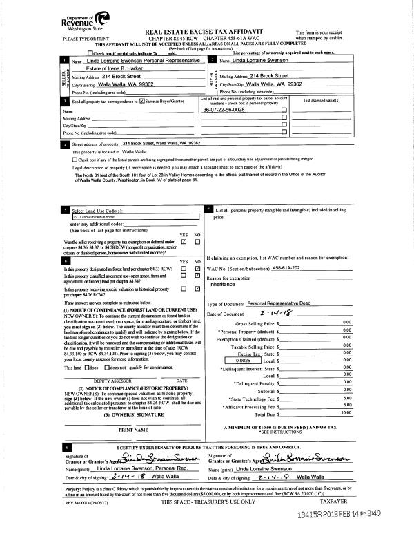 | 1 | 02/14/2018 | DPR | DEED OF PERSONAL REPRESENTATIVE | HARKER IRENE B | SWENSON LINDA LORRAINE | | | $0.00 | 134158 | 2018-01288 |