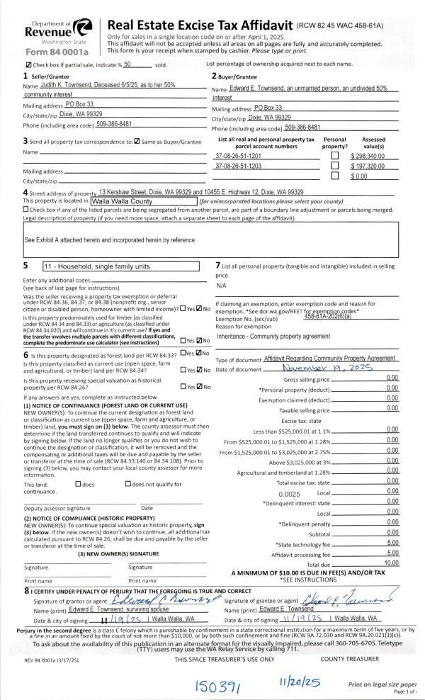 | 2 | 11/20/2025 | COMMUNITY | COMMUNITY PROPERTY AGREEMENT | TOWNSEND EDWARD E & JUDITH K | TOWNSEND EDWARD E | | | | 150391 | 2025-07208 |