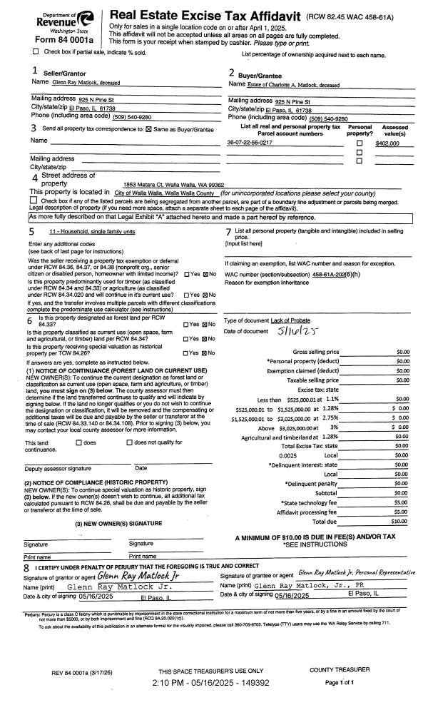 | 2 | 05/16/2025 | LOPA | LACK OF PROBATE AFFIDAVIT | MATLOCK GLENN & CHARLOTTE | MATLOCK CHARLOTTE ESTATE OF | | | | 149392 | 2025-02712 |