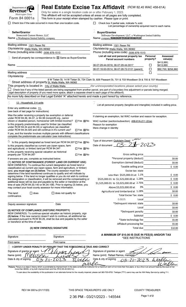 | 1 | 03/21/2023 | QCD | QUIT CLAIM DEED | STONE CREEK CUSTOM HOMES LLC | STILLWATER DEVELOPMENT LLC | | | | 145544 | 2023-01456 |