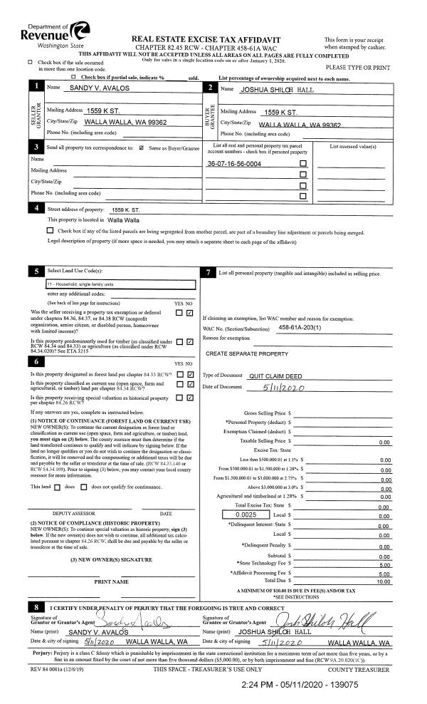 | 2 | 05/11/2020 | QCD | QUIT CLAIM DEED | AVALOS SANDY V | HALL JOSHUA SHILOH | | | | 139075 | 2020-04041 |