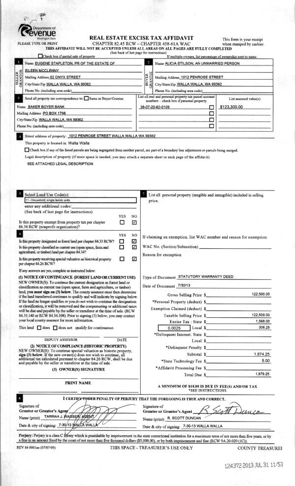 | 2 | 07/31/2013 | WARRANTY D | WARRANTY DEED | MC CLENNY, EILEEN F ESTATE OF | STILSON, ALICIA | | | $122,500.00 | 124372 | 2013-07749 |