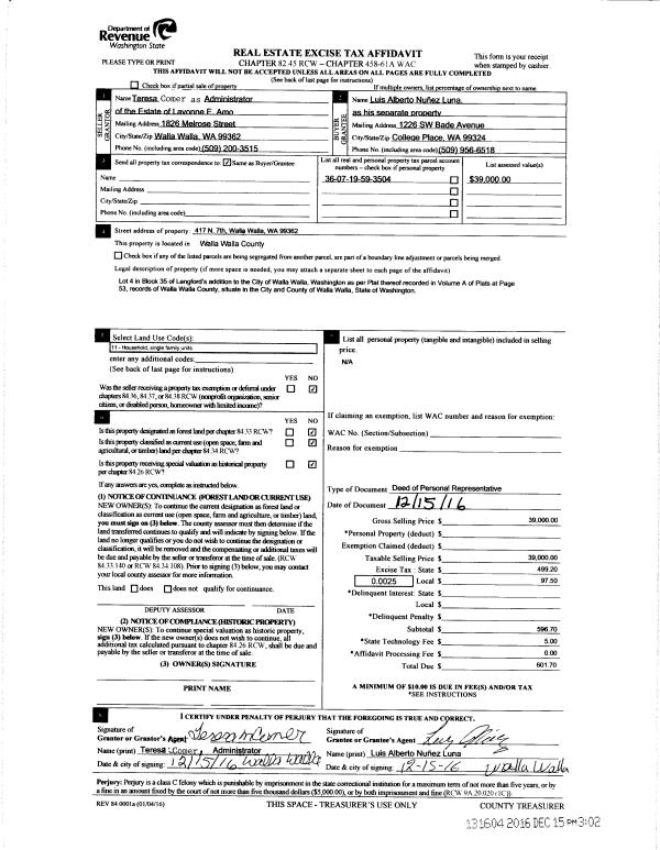 | 1 | 12/15/2016 | DPR | DEED OF PERSONAL REPRESENTATIVE | AMO LAVONNE E ESTATE OF | NUNEZ LUNA LUIS ALBERTO | | | $39,000.00 | 131604 | 2016-10323 |