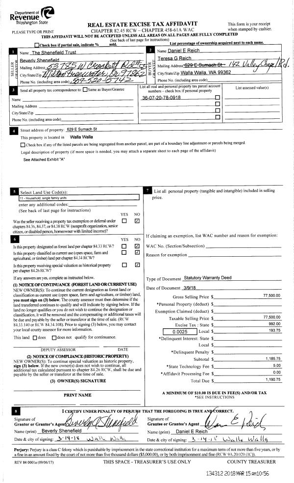 | 3 | 03/15/2018 | SWD | STATUTORY WARRANTY DEED | SHENEFIELD TRUST | REICH DANNY E & TERESA G | | | $77,500.00 | 134312 | 2018-02013 |