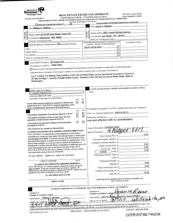 | 3 | 08/04/2017 | QCD | QUIT CLAIM DEED | WINTERS WILLIAM H | WINTERS JOYCE A | | | $0.00 | 132935 | 2017-06014 |