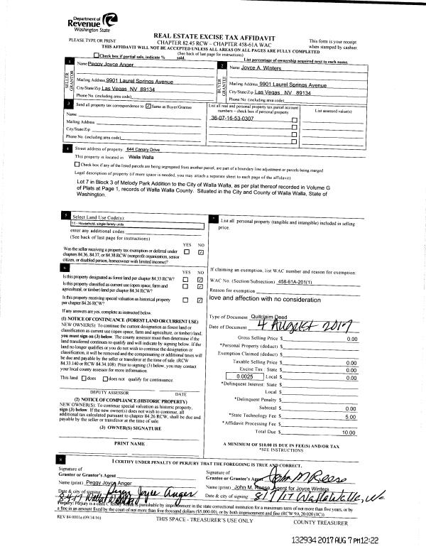 | 4 | 08/04/2017 | QCD | QUIT CLAIM DEED | ANGER PEGGY JOYCE | WINTERS JOYCE A | | | $0.00 | 132934 | 2017-06015 |