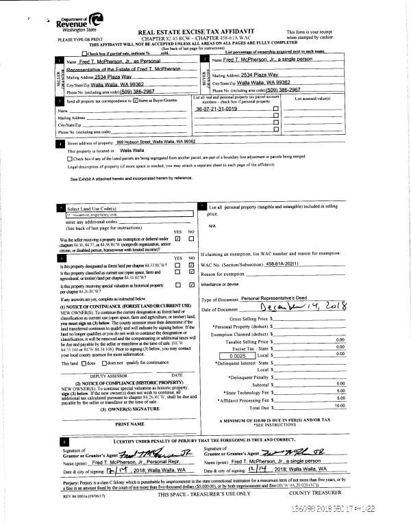 | 1 | 12/14/2018 | DPR | DEED OF PERSONAL REPRESENTATIVE | MC PHERSON FRED T | MC PHERSON FRED T JR | | | $0.00 | 136098 | 2018-10388 |