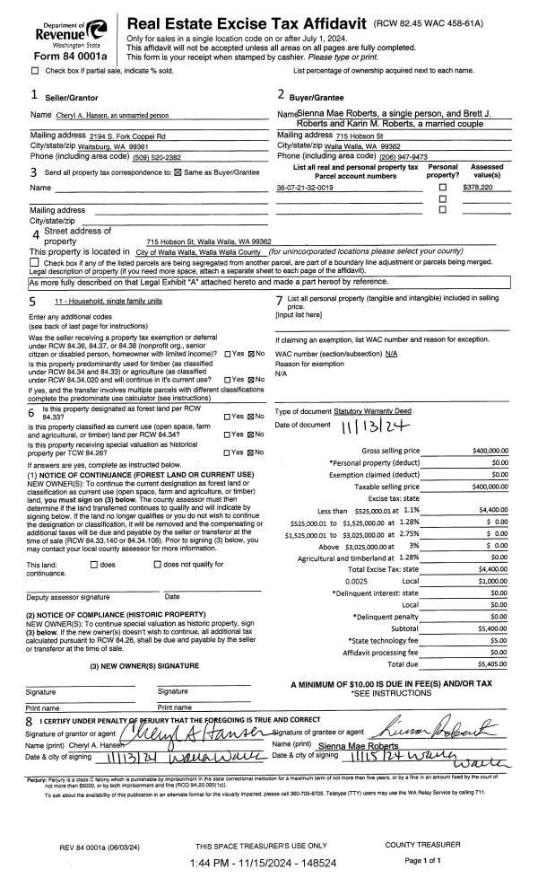 | 1 | 11/15/2024 | SWD | STATUTORY WARRANTY DEED | HANSEN CHERYL A | ROBERTS SIENNA MAE | | | $400,000.00 | 148524 | 2024-06657 |