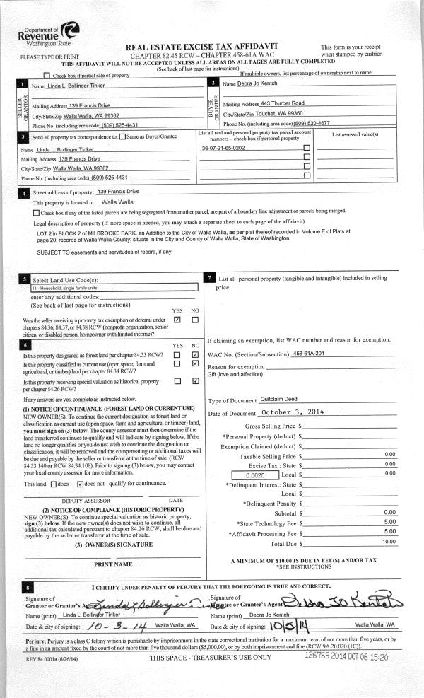 | 1 | 10/03/2014 | QCD | QUIT CLAIM DEED | TINKER LINDA L BOLLINGER | TINKER LINDA L BOLLINGER LIFE ESTATE | | | $0.00 | 126769 | 2014-07354 |