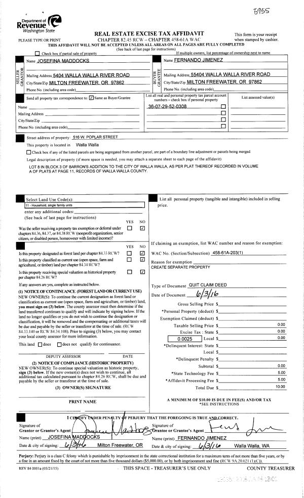 | 3 | 06/06/2016 | QCD | QUIT CLAIM DEED | MADDOCKS JOSEFINA | JIMENEZ FERNANDO | | | | 130351 | 2016-04233 |