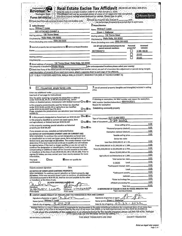 | 1 | 11/18/2022 | QCD | QUIT CLAIM DEED | LUCAS WHITNEY P | LUCAS WHITNEY P & SHAWN J STALBERGER | | | $0.00 | 143650 | 2022-09230 |