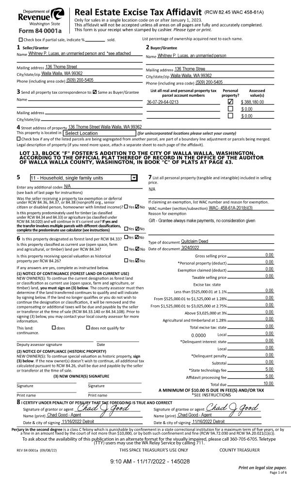 | 2 | 11/18/2022 | QCD | QUIT CLAIM DEED | LUCAS WHITNEY P | LUCAS WHITNEY P | | | $0.00 | 145028 | 2022-09229 |