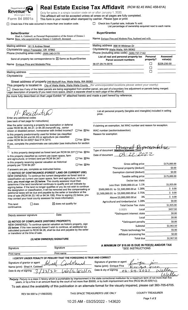 | 1 | 03/25/2022 | DPR | DEED OF PERSONAL REPRESENTATIVE | BENZ DONNA J ESTATE OF | PINA ENRIQUE & MODESTA | | | $175,000.00 | 143620 | 2022-02486 |