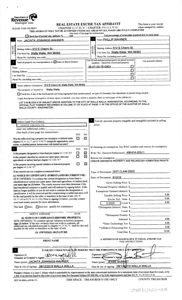| 1 | 08/14/2019 | QCD | QUIT CLAIM DEED | JENNINGS-WAHNER JACINTA | WAHNER PHILLIP | | | | 137488 | 2019-06114 |