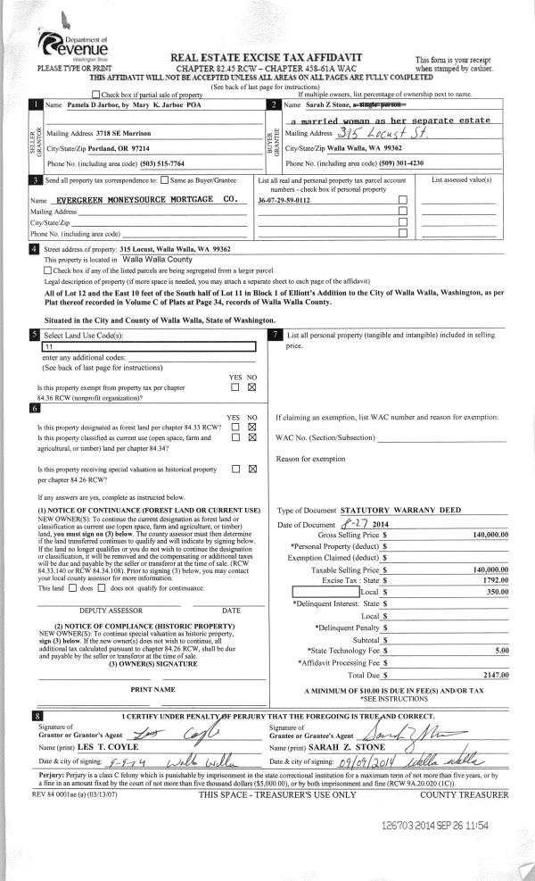 | 3 | 08/27/2014 | SWD | STATUTORY WARRANTY DEED | JARBOE PAMELA D | STONE SARAH Z | | | $140,000.00 | 126703 | 2014-07061 |