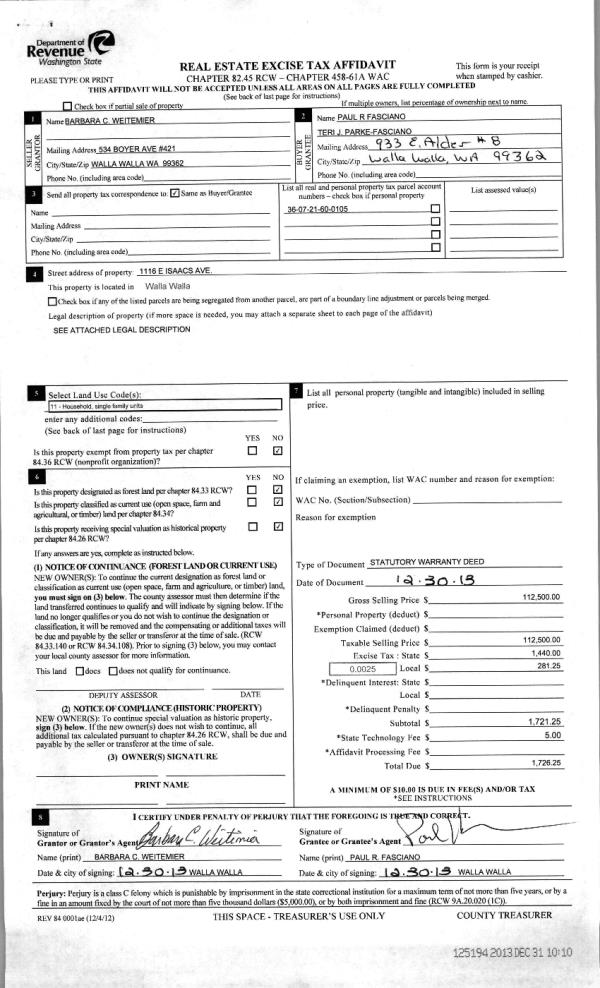 | 2 | 12/31/2013 | WARRANTY D | WARRANTY DEED | WEITEMIER-STEWART BARBARA C | FASCIANO PAUL R & TERI J PARKE-FASCIANO | | | $112,500.00 | 125194 | 2013-12370 |