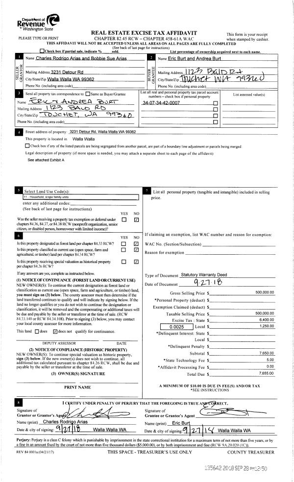 | 1 | 09/28/2018 | SWD | STATUTORY WARRANTY DEED | ARIAS CHARLES R & BOBBIE | BURT ERIC & ANDREA | | | $500,000.00 | 135642 | 2018-08107 |