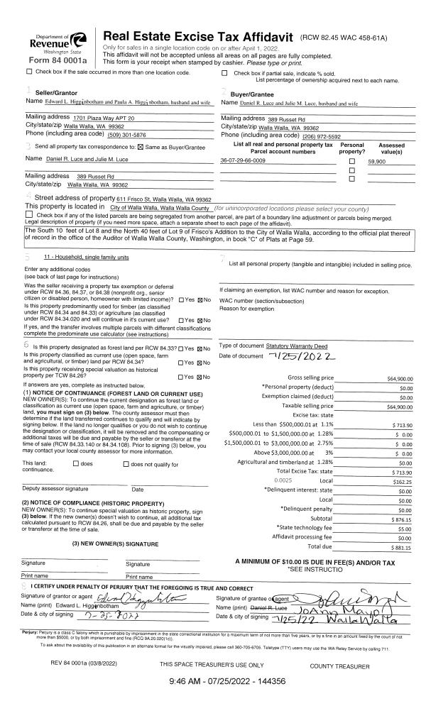 | 2 | 07/25/2022 | SWD | STATUTORY WARRANTY DEED | HIGGINBOTHAM EDWARD & PAULA | LUCE DANIEL R & JULIE M | | | $64,900.00 | 144356 | 2022-06203 |