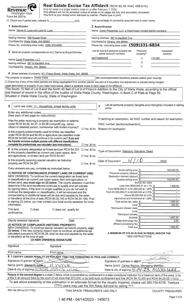 | 1 | 04/14/2023 | SWD | STATUTORY WARRANTY DEED | LUCE DANIEL R & JULIE M | CARELI PROPERTIES LLC | | | $145,000.00 | 145673 | 2023-01985 |