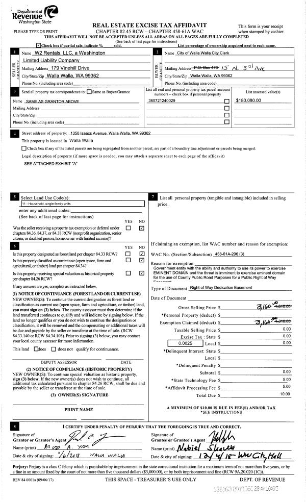 | 2 | 12/28/2018 | EASE | EASEMENT | W2 RENTALS LLC | WALLA WALLA CITY OF | | | $3,160.00 | 136163 | 2018-10654 |