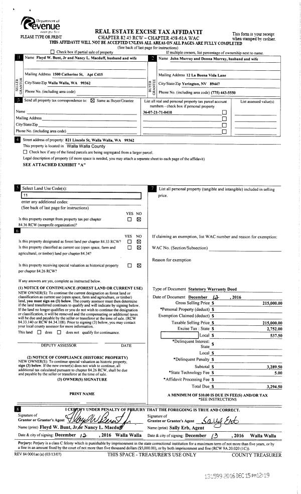 | 1 | 12/15/2016 | SWD | STATUTORY WARRANTY DEED | BUNT FLOYD W JR | MURRAY JOHN & DONNA | | | $215,000.00 | 131599 | 2016-10311 |