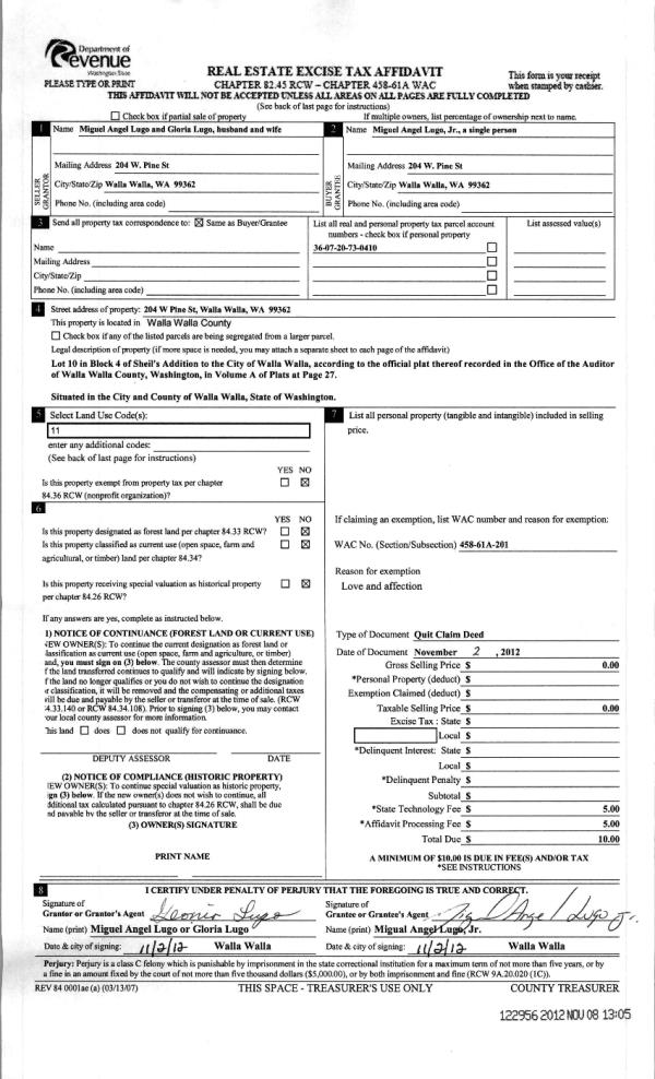 | 2 | 11/08/2012 | QCD | QUIT CLAIM DEED | LUGO, MIGUEL ANGEL & GLORIA | LUGO, MIGUEL ANGEL JR | | | $0.00 | 122956 | 2012-09915 |