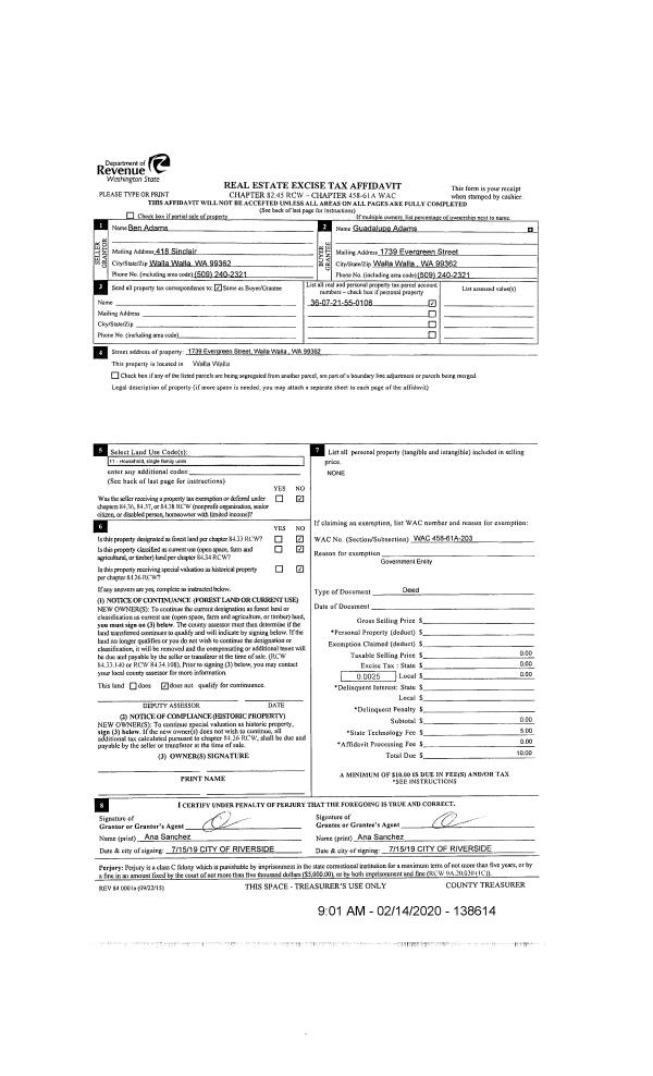 | 2 | 07/17/2019 | QCD | QUIT CLAIM DEED | ADAMS BEN | ADAMS GUADALUPE | | | $0.00 | 138614 | 2020-01383 |