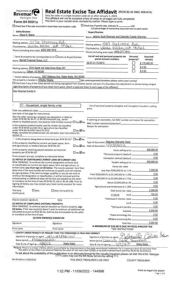 | 1 | 11/10/2022 | SWD | STATUTORY WARRANTY DEED | MAINE ALEXA N | SHERMAN JEREMY SCOTT & GABRIELLE COLETTE | | | $299,999.00 | 144998 | 2022-09048 |