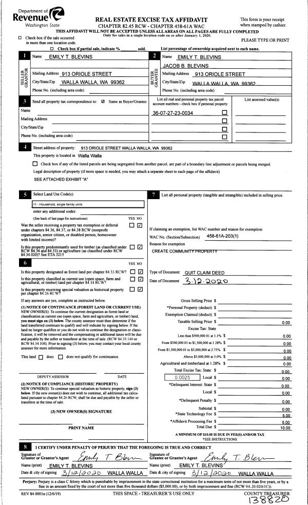 | 2 | 03/12/2020 | QCD | QUIT CLAIM DEED | CAULK EMILY T | BLEVINS EMILY T & JACOB B | | | $0.00 | 138820 | 2020-02446 |