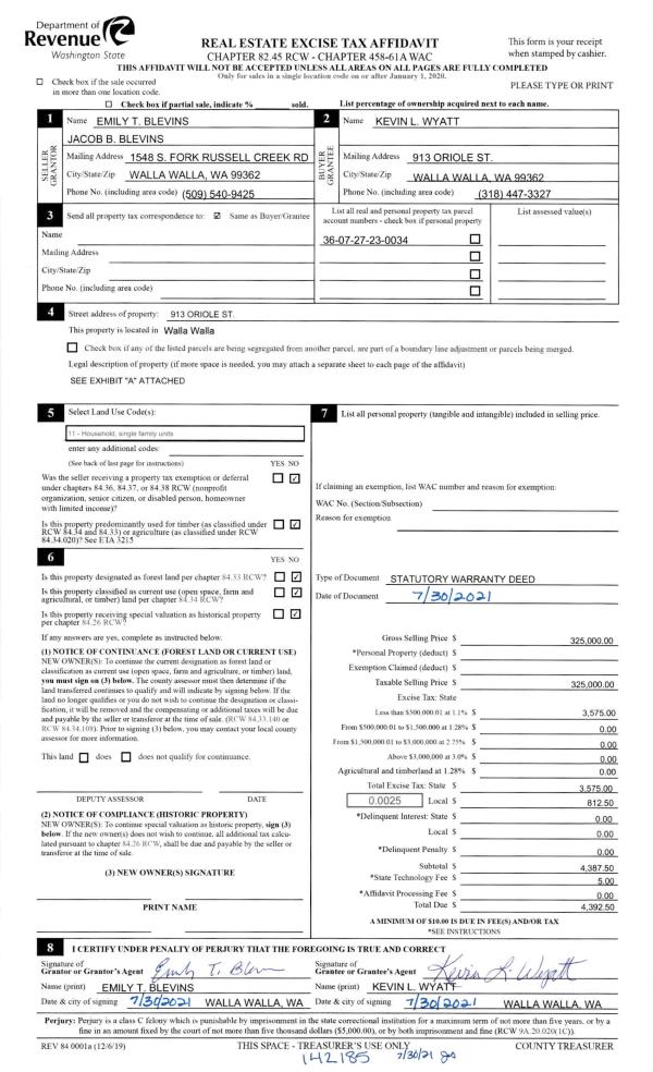 | Mailing Address: | 913 ORIOLE ST WALLA WALLA, WA 99362 | % Ownership: | 100.0000000000% |