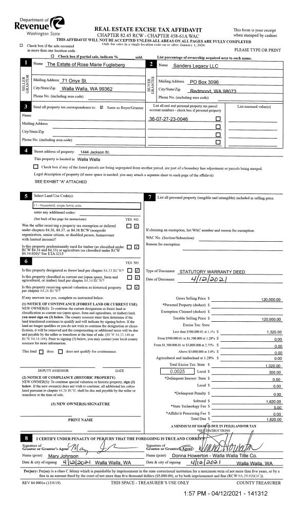 | 2 | 04/12/2021 | SWD | STATUTORY WARRANTY DEED | FUGLEBERG ROSE MARIE ESTATE OF | SANDERS LEGACY LLC | | | $120,000.00 | 141312 | 2021-04249 |