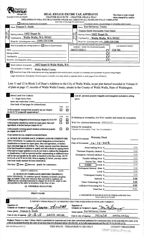 | 2 | 11/27/2018 | WARRANTY D | WARRANTY DEED | SMITH FRANCIS E | SMITH FRANCES IRREVOCABLE TRUST | | | $0.00 | 135987 | 2018-09768 |