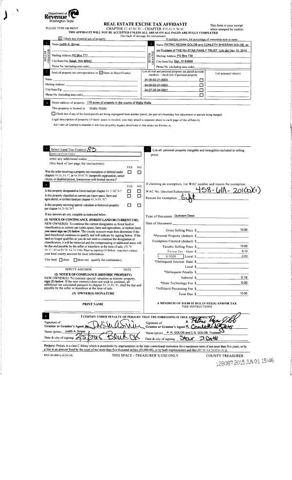 | 6 | 06/01/2015 | QCD | QUIT CLAIM DEED | SINNER JUDITH A | SINNER JUDITH A ET AL | 3 PARCELS | | | 128087 | 2015-04654 |