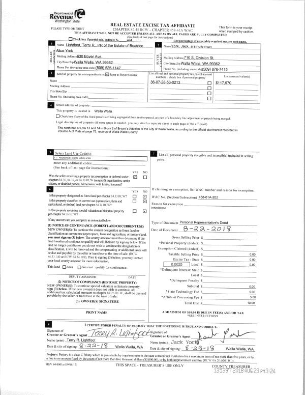 | 4 | 08/22/2018 | DPR | DEED OF PERSONAL REPRESENTATIVE | YORK BEATRICE A | YORK JACK | | | $0.00 | 135397 | 2018-06979 |
