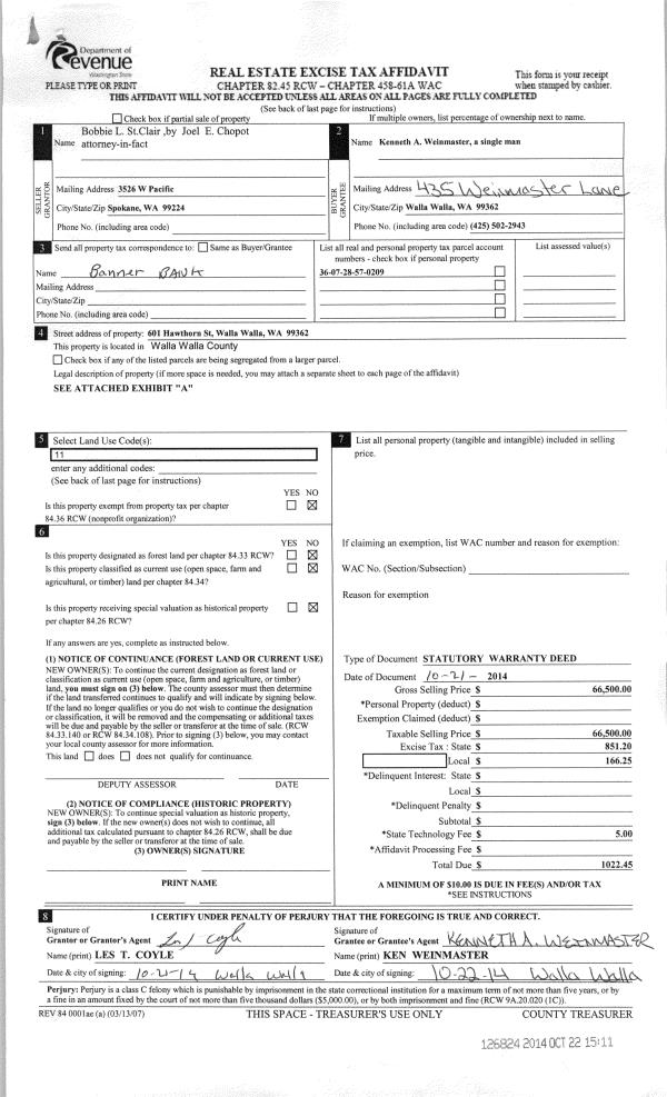 | 1 | 10/22/2014 | SWD | STATUTORY WARRANTY DEED | ST CLAIR BOBBIE L | WEINMASTER KENNETH A | | | $66,500.00 | 126824 | 2014-07732 |