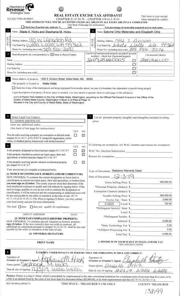 | 1 | 12/04/2019 | SWD | STATUTORY WARRANTY DEED | HICKS WADE A & STEPHANIE M | MELENDEZ SALOME ORTIZ & ELISABETH ORTIZ | | | $300,000.00 | 138199 | 2019-10045 |