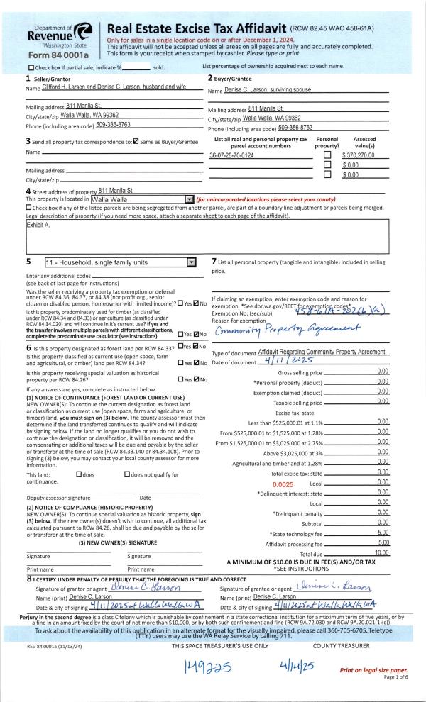 | 1 | 04/14/2025 | COMMUNITY | COMMUNITY PROPERTY AGREEMENT | LARSON CLIFFORD H & DENISE C | LARSON DENISE C | | | | 149225 | 2025-01967 |
