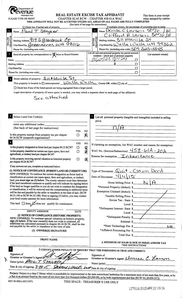 | 3 | 04/04/2015 | QCD | QUIT CLAIM DEED | STRYKER PAUL T | LARSON CLIFFORD H & DENISE C | | | $0.00 | 127816 | 2015-03206 |
