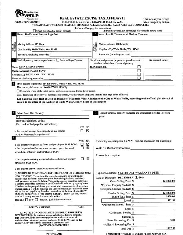 | 2 | 12/03/2014 | SWD | STATUTORY WARRANTY DEED | LIGHTFOOT LEOTA ESTATE OF | THOMSON MARK A & LISA K | | | $125,000.00 | 127040 | 2014-08743 |