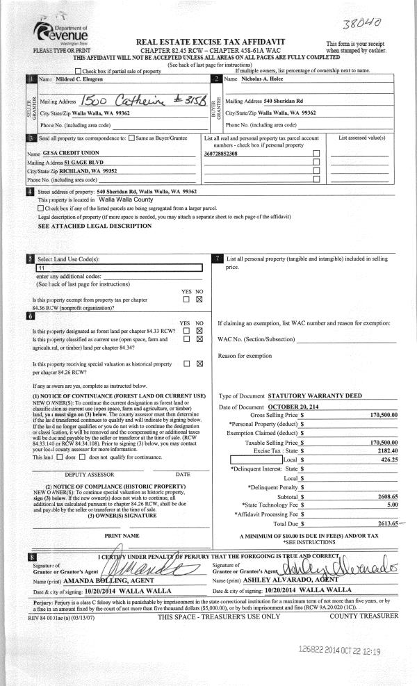 | 4 | 10/22/2014 | SWD | STATUTORY WARRANTY DEED | ELMGREN MILDRED C | HOLCE NICHOLAS A | | | $170,500.00 | 126822 | 2014-07726 |