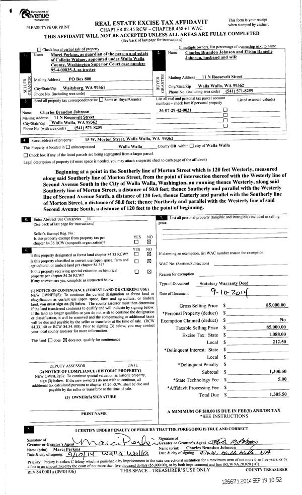 | 2 | 09/10/2014 | SWD | STATUTORY WARRANTY DEED | WIDNER COLLETTE ESTATE OF | JOHNSON CHARLES BRANDON | | | $85,000.00 | 126671 | 2014-06869 |