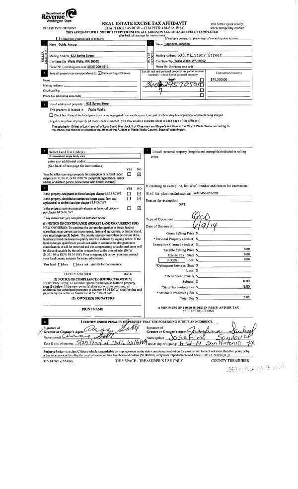 | 1 | 06/09/2014 | QCD | QUIT CLAIM DEED | GOBLE AURORA | SANDOVAL JOSEFINA | | | | 126038 | 2014-03942 |