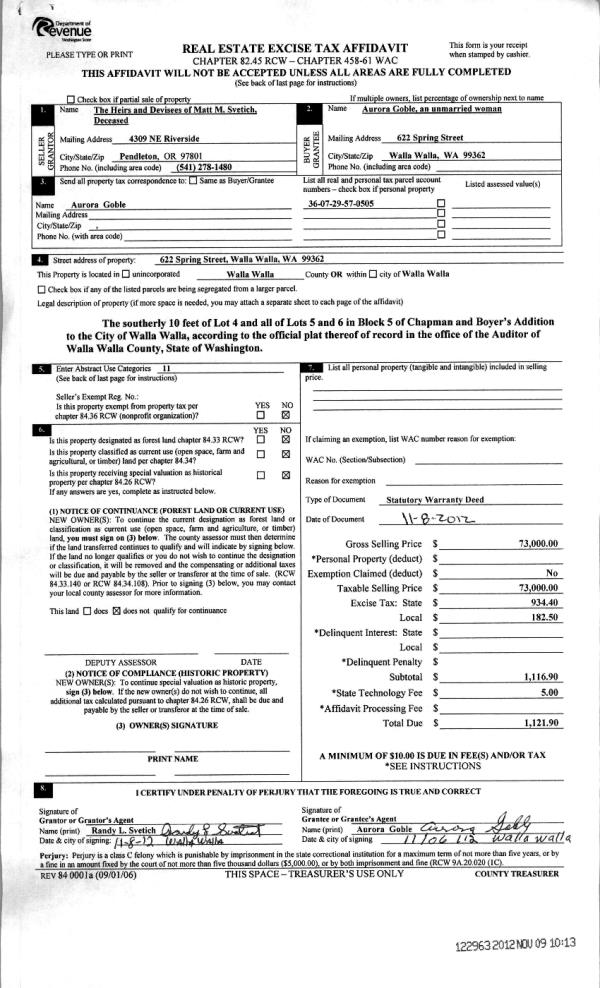 | 2 | 11/09/2012 | WARRANTY D | WARRANTY DEED | SVETICH, MATT M ESTATE OF | GOBLE, AURORA | | | $73,000.00 | 122963 | 2012-09931 |